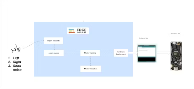 首先,我們將創(chuàng)建一個數(shù)據(jù)庫,并將樣本數(shù)據(jù)標記為“右”,“左”,背景道路噪聲和“道路噪聲”作為單獨的數(shù)據(jù)集。隨后,我們將使用邊緣脈沖啟動模型訓(xùn)練過程?;隍炞C的結(jié)果,可能需要調(diào)整訓(xùn)練參數(shù)或合并額外的數(shù)據(jù)集,然后重新訓(xùn)練模型以提高其性能。一旦模型已成功訓(xùn)練和驗證,達到可接受的精度水平,我們將繼續(xù)利用Arduino庫將其部署在Portenta H7硬件上。