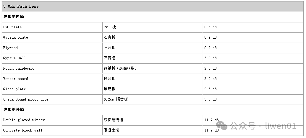 5G WiFi典型穿透損耗經(jīng)驗(yàn)值