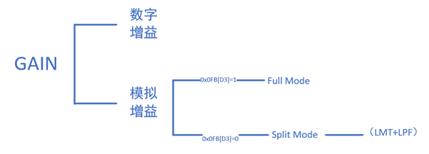 Split模式下模擬總增益最大值可由寄存器0x0FD設(shè)置,最大值為40(十進(jìn)制),由LMT和LPF兩部分組成。