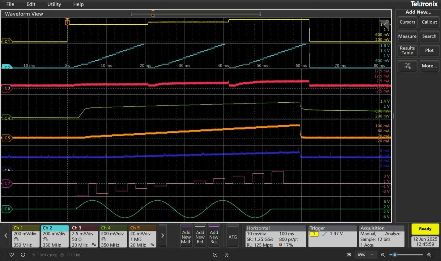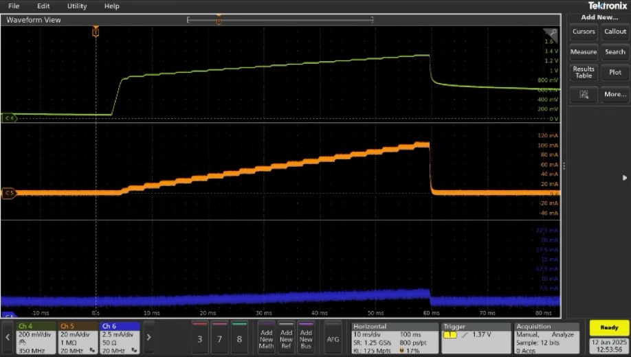 圖5顯示了該觸發(fā)模型序列在示波器上捕獲的輸出。柵極波形(上方)與漏極掃描(中間)完全同步,時(shí)間上無顯著延遲。