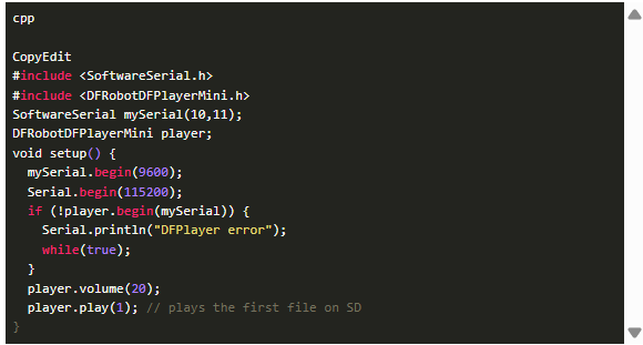 使用DFRobotDFPlayerMini庫(kù),一個(gè)簡(jiǎn)單的草圖可以: