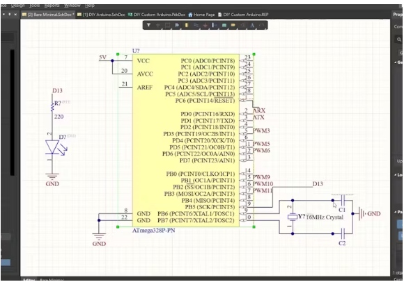 為了制作我們的Arduino板,我們需要一個微控制器,它將完成所有的數(shù)學計算和所有的邏輯決策。那么我們在Arduino板上使用哪個微控制器呢?在這里,將使用ATMega328。微控制器沒有基本要素就不能運行。為了發(fā)揮作用,它只需要進行少量的設(shè)置。讓我們看一下最簡單的配置。