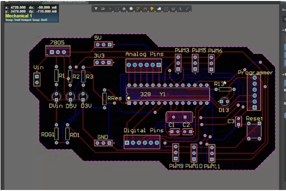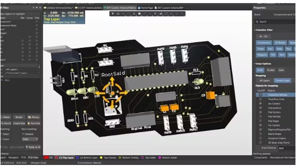 一旦電路完成,我就開始在PCB布局上工作。使用Altium設(shè)計器,創(chuàng)建PCB布局非常容易。我們可以簡單地安排板內(nèi)的所有組件,路由軌道和創(chuàng)建板布局,所有這些都可以在10分鐘內(nèi)完成。