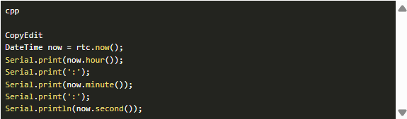 代碼首先初始化RTC并檢查它是否正在運(yùn)行。如果是第一次設(shè)置,可以使用rts .adjust()設(shè)置時(shí)間。之后,您可以使用rtc連續(xù)讀取當(dāng)前時(shí)間和日期。現(xiàn)在(),然后打印或顯示在LCD或串行監(jiān)視器上。