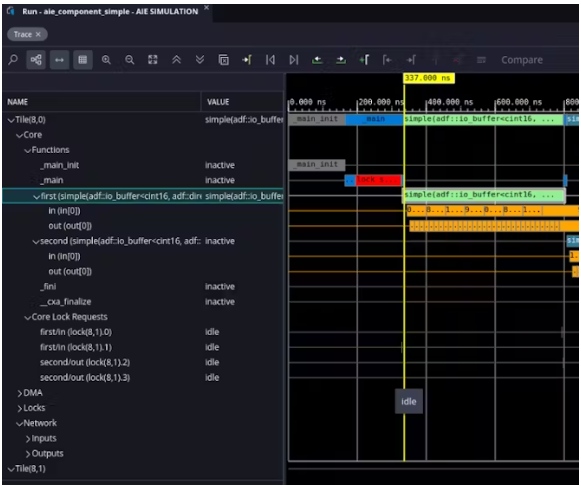在進行更改并運行AI引擎模擬器并啟用trace后,我們可以看到內(nèi)核的第一次調(diào)用現(xiàn)在發(fā)生在337ns之后
