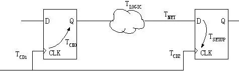 圖1 周期的定義 時(shí)鐘的最小周期為: TCLK = TCKO +TLOGIC +TNET +TSETUP -TCLK_SKEW TCLK_SKEW =TCD2 -TCD1 其中TCKO為時(shí)鐘輸出時(shí)間,TLOGIC為同步元件之間的組合邏輯延遲,TNET為網(wǎng)線延遲,TSETUP為同步元件的建立時(shí)間,TCLK_SKEW為時(shí)鐘信號(hào)TCD2和TCD1延遲的差別。 D 數(shù)據(jù)和時(shí)鐘之間的約束 為了確保芯片數(shù)據(jù)采樣可靠和下級(jí)芯片之間正確地交換數(shù)據(jù),需要約束外部時(shí)鐘和數(shù)據(jù)輸入輸出引腳之間的時(shí)序關(guān)系(或者內(nèi)部時(shí)鐘和外部輸入/輸出數(shù)據(jù)之間的關(guān)系,這僅僅是從采用了不同的參照系罷了)。約束的內(nèi)容為告訴綜合器、布線器輸入數(shù)據(jù)到達(dá)的時(shí)刻,或者輸出數(shù)據(jù)穩(wěn)定的時(shí)刻,從而保證與下一級(jí)電路的時(shí)序關(guān)系。 這種時(shí)序約束在Xilinx中用Setup to Clock(edge),Clock(edge) to hold等表示。在Altera里常用tsu (Input Setup Times)、th (Input Hold Times)、tco (Clock to Out Delays)來表示。很多其它時(shí)序工具直接用setup和hold表示。其實(shí)他們所要描述的是同一個(gè)問題,僅僅是時(shí)間節(jié)點(diǎn)的定義上略有不同。下面依次介紹。 E 關(guān)于輸入到達(dá)時(shí)間 Xilinx的“輸入到達(dá)時(shí)間的計(jì)算”時(shí)序描述如下圖所示: