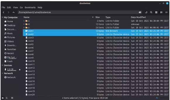 為了正確設(shè)置COM1端口,我們必須刪除現(xiàn)有的COM1端口。您可以很容易地做到這一點,在Linux中進入文件管理器,并進入“/home/[username]/”。Wine /dosdevices”,就像在終端中一樣。