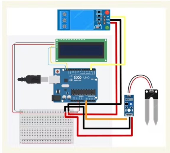 土壤濕度傳感器電路包含4個(gè)電子元件,其中土壤濕度傳感器檢測(cè)土壤濕度水平,Arduino板處理土壤濕度傳感器模擬量輸入并將其轉(zhuǎn)換為百分比形式,并根據(jù)土壤濕度水平控制何時(shí)啟動(dòng)灌溉過程,LCD顯示屏顯示土壤濕度水平的百分比,灌溉狀態(tài)和泵狀態(tài)。和一個(gè)有效的低繼電器控制泵的激活/停用。