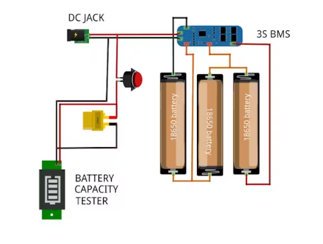 將三個(gè)18650電池串聯(lián)成一個(gè)3S電池組(11.1V標(biāo)稱)。完全按照?qǐng)D中所示接線: