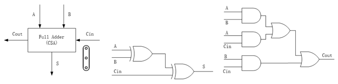 一個全加器有三個輸入: A , B , C (進位) 和兩個輸出S , C′(輸出進位) , 3個輸入對2個輸出而言是對稱的, 即它們互相交換位置, 結(jié)果不會受影響。如果把一串全加器簡單排成一行, 它們之間進位線不連, 把這樣一串全加器稱為保留進位加法器(CSA ) , 它有以下特性: 三個輸入數(shù)之和等于二個輸出數(shù)之和, 即3個相加數(shù)每通過一次保留進位加法器, 其個數(shù)就減少1個。