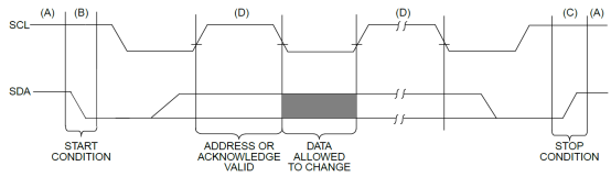 D段分為兩段數(shù)據(jù)有效段(ADDRESS OR ACKNOWLEDGE)和數(shù)據(jù)修改段(DATA ALLOWED TO CHANGE)。在傳輸數(shù)據(jù)時,在 SCL 為高電平期間,SDA 不能夠發(fā)生改變,視為數(shù)據(jù)有效段;在傳輸數(shù)據(jù)時,在 SCL 為低電平期間,SDA 可以發(fā)生改變(修改為下一個要發(fā)送的bit),視為數(shù)據(jù)修改段。