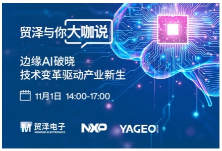 2025年10月27日 – 提供超豐富半導(dǎo)體和電子元器件?的業(yè)界知名新品引入 (NPI) 代理商貿(mào)澤電子 (Mouser Electronics)宣布,2025年“貿(mào)澤與你大咖說”系列技術(shù)活動(dòng)將于11月1日14:00-17:00在線舉辦。本期貿(mào)澤電子將聯(lián)袂半導(dǎo)體巨頭恩智浦和電子元器件領(lǐng)導(dǎo)企業(yè)國巨,匯聚多位資深技術(shù)專家,以“邊緣AI 破曉,技術(shù)變革驅(qū)動(dòng)產(chǎn)業(yè)新生”為主題,共同探討邊緣智能時(shí)代的關(guān)鍵技術(shù)突破,為產(chǎn)業(yè)升級注入強(qiáng)勁動(dòng)能。