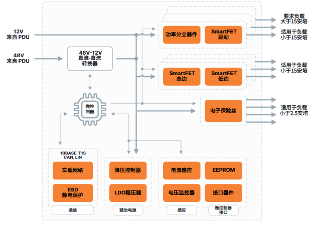 單個電源分配單元 (PDU) 充當配電樹的第一級。 PDU 連接到車輛的低壓 (LV) 電池或 HV-LV DC-DC 轉換器的輸出端, 由轉換器將高壓 (HV) 電池的電壓降低。 PDU 通過大電流保險絲提供主要保護, 并將電力智能分配至車輛內的各個區(qū)域, 確保高效可靠的電源管理。 ZCU 在各自區(qū)域內進一步分配電力并管理電氣元件, 大大減輕了線束的重量和復雜性。