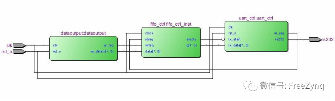 我們將這三個模塊分別定義為dataoutput塊,fifo_ctrl塊和uart_ctrl塊。現(xiàn)在考慮連線,具體到每一根連線,這樣根據(jù)圖來寫代碼要比直接用腦子構(gòu)圖要方便的多。三個模塊,先考慮時鐘和復(fù)位信號線,三個模塊都有,然后,數(shù)據(jù)產(chǎn)生模塊要將產(chǎn)生的數(shù)據(jù)發(fā)給FIFO模塊,所以要有數(shù)據(jù)寫入線,我們定義它為wr-datain,數(shù)據(jù)寫入FIFO塊后總要輸出,這些數(shù)據(jù)就是我們要發(fā)送的數(shù)據(jù),所以定義輸出數(shù)據(jù)線tx_data,先不管FIFO,我們再來定義數(shù)據(jù)發(fā)送模塊的連線,數(shù)據(jù)發(fā)送總要有個啟動信號,所以我們定義變量tx_start,之后,還要有一個輸出端給PC機,我們定義這個輸出端位rs232。