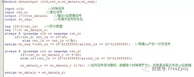 設(shè)計完端口之后我們就來設(shè)計底層模塊,先設(shè)計數(shù)據(jù)產(chǎn)生模塊dataoutput,這個部分主要是產(chǎn)生數(shù)據(jù),可用一個分頻電路實現(xiàn)每1s發(fā)送一次的數(shù)據(jù),產(chǎn)生這16位數(shù)據(jù)的時候,需要16個時鐘,每個時鐘數(shù)據(jù)自加1,總體來說比較簡單
