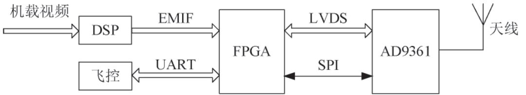 無(wú)人機(jī)機(jī)載數(shù)據(jù)鏈設(shè)備的系統(tǒng)架構(gòu)如圖1 所示。首先,F(xiàn)PGA 通過(guò)EMIF 接收DSP 的高清壓縮視頻、通過(guò)UART 接收飛控計(jì)算機(jī)的遙測(cè)數(shù)據(jù),壓縮后的視頻數(shù)據(jù)和遙測(cè)數(shù)據(jù)在FPGA 組幀編碼調(diào)制后通過(guò)LVDS 發(fā)送到AD9361,AD9361 對(duì)數(shù)據(jù)進(jìn)行上變頻后經(jīng)由天線發(fā)射出去; 同時(shí),AD9361 對(duì)天線接收到的信號(hào)進(jìn)行下變頻后,通過(guò)LVDS 將地面的遙控?cái)?shù)據(jù)發(fā)送到FPGA,數(shù)據(jù)在FPGA 中經(jīng)過(guò)解調(diào)譯碼解幀后通過(guò)UART 發(fā)送到飛控計(jì)算機(jī)中。其中,AD9361 的配置是FPGA 通過(guò)SPI 讀寫寄存器完成的。
