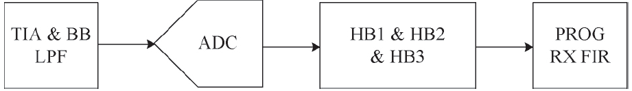 圖4 給出了接收端濾波器的通路,天線接到的模擬信號(hào)經(jīng)過(guò)一個(gè)單極低通濾波器TIA LPF 和一個(gè)3 階巴特沃斯低通濾波器BB LPF 后進(jìn)入到ADC 中進(jìn)行模數(shù)轉(zhuǎn)換,然后經(jīng)過(guò)HB1、HB2、HB3 等3 個(gè)半帶濾波器和FIR 濾波器輸出IQ 兩路數(shù)據(jù)到后面的數(shù)字信號(hào)處理模塊。