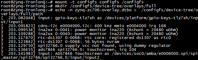 Target# echo -n zynq-zc706-overlay.dtbo > /configfs/device-tree/overlays/full/path
