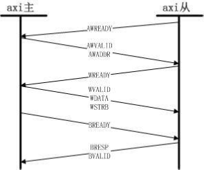 寫操作順序為主與從進(jìn)行寫地址通道握手并傳輸?shù)刂穬?nèi)容,然后在寫數(shù)據(jù)通道握手并傳輸所讀內(nèi)容,最后再寫回應(yīng)通道握手,并傳輸寫回應(yīng)數(shù)據(jù),時鐘上升沿有效。如圖所示: