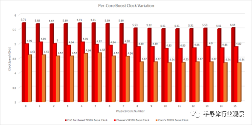 Cheese 的 5950X 在核心 1 和 4 上達到了最高時鐘。兩者都位于第一個 CCD 上。我的 3950X 在核心 4 和 5 上的時鐘頻率最高。兩者也在第一個 CCD 上。這是一個奇怪的模式。也許 AMD 只是binning一個 CCD 以達到 16 個核心部件的最大升壓時鐘。