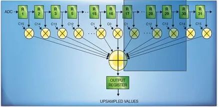圖3 - 當(dāng)濾波器工作在基本ADC時(shí)鐘頻率的M倍頻率時(shí),零插入步驟中使用31抽頭FIR濾波器每時(shí)鐘周期可生成一個(gè)上采樣數(shù)據(jù)值