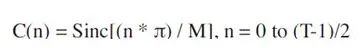 如圖4所示,您可以設(shè)定窗口SINC函數(shù)的系數(shù)Cw(n)來(lái)限度地減少實(shí)現(xiàn)該FIR濾波器所需的乘法器數(shù)量。對(duì)于T個(gè)抽頭的低通FIR濾波器而言,可通過下式得出系數(shù):