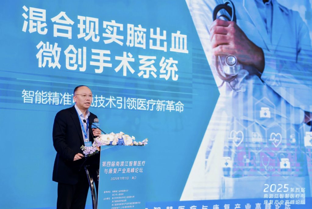 在第四屆南渡江智慧醫(yī)療與康復產業(yè)高峰論壇上,上海醫(yī)科數博醫(yī)療科技有限公司的創(chuàng)始人 孫樹杰教授進行了題為《混合現實MR腦出血智能微創(chuàng)手術系統(tǒng)》的演講。