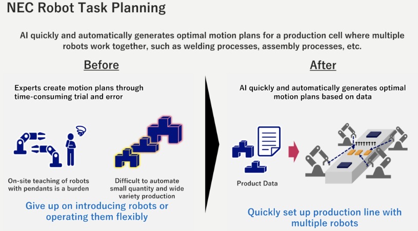 作為 NEC BluStellar 計劃的重要組成部分,NEC 的“機器人任務規(guī)劃”軟件搭載了專有算法,可優(yōu)化多機器人協(xié)同作業(yè),并通過 AI 自動生成機器人運動規(guī)劃。
