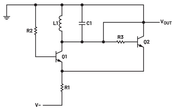 不同于采用單個晶體管的Clapp、Colpitts和Hartley振蕩器,Peltz配置使用兩個晶體管。觀察圖1,注意晶體管Q1配置為共基極放大器級。由L1和C1組成的諧振電路提供集電極負載。集電極的輸出饋送到晶體管Q2的基極。Q2配置為射極跟隨器(共集電極)級。當(dāng)射極跟隨器(Q2發(fā)射極)的輸出連接回Q1發(fā)射極處的共基極級輸入時,形成振蕩所需的正反饋。共基極放大器級的電壓增益在LC諧振電路的并聯(lián)諧振頻率處達到最大值,此時其阻抗接近無窮大。射極跟隨器的增益總是略小于1。環(huán)路周圍的組合增益在諧振時將遠大于1,以維持振蕩。