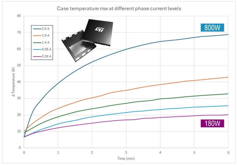 該GaN開關(guān)管可以安全地輸出約 800 W 的功率,而不會發(fā)生熱失控。溫升 Δt 小于 70 °C,在達(dá)到 150 °C 的最高工作結(jié)溫 (TJmax)之前,有充足的安全裕量。