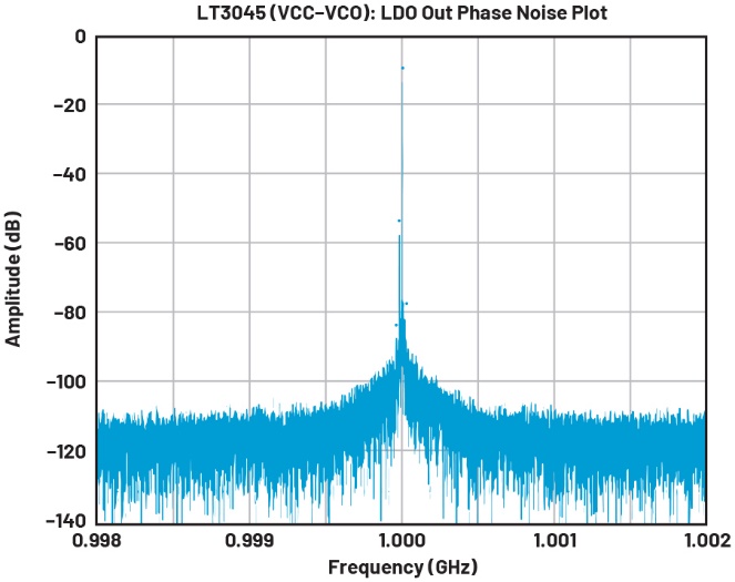 圖2.作為基準的LT3045相位噪聲圖(1 GHz,2 MHz范圍)
