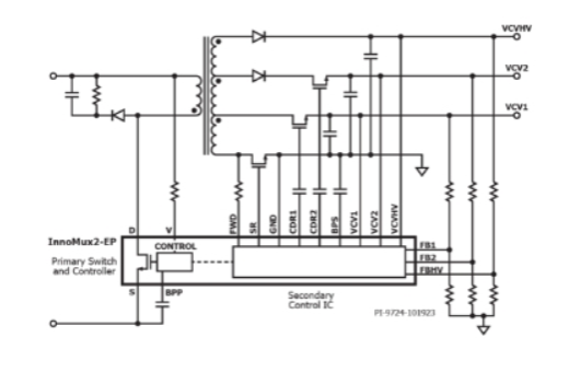 本方案采用的IMX2379F是PI旗下InnoMux?-2系列反激式開關IC中的一員。InnoMux?-2是Single-stage、獨立穩(wěn)壓多輸出離線式電源IC,它創(chuàng)新地將AC-DC和下游DC-DC轉換級集成于單一芯片。與傳統(tǒng)兩級架構相比,該IC去掉了單獨的DC-DC級,可大幅減少元件數(shù)量,縮小PCB占位面積。并且憑借其750V PowiGaN?氮化鎵晶體管、零電壓開關及同步整流技術,進一步提升了系統(tǒng)效率。