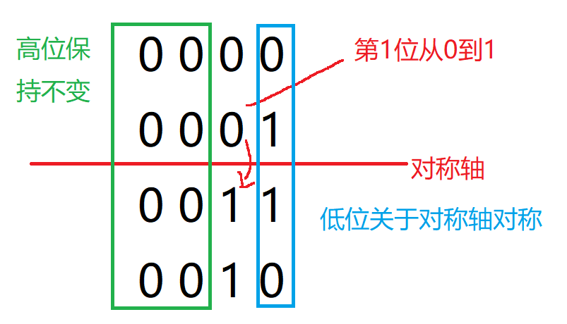 所以接下來就要介紹格雷碼的第二個(gè)性質(zhì)了:當(dāng)?shù)贜位從0變到1的時(shí)候,之后的數(shù)的N-1位會(huì)關(guān)于前半段軸對(duì)稱,而比N位高的位是相同的。