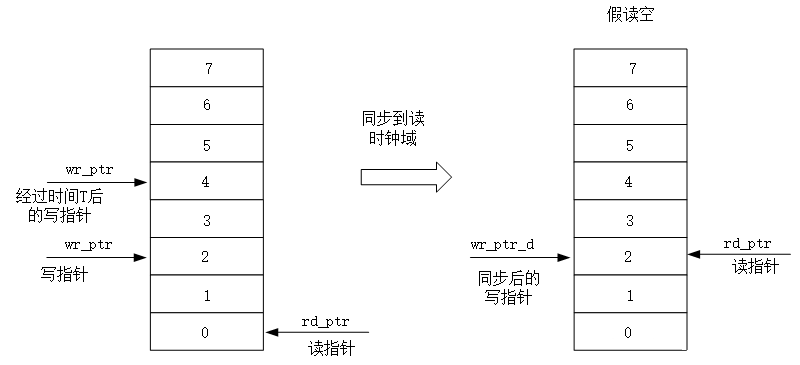 還真有,但是沒意義。既然我們可以將讀指針同步到寫時(shí)鐘域來判斷假滿;將寫指針同步到讀時(shí)鐘域來判斷假空。那么對(duì)應(yīng)地,可以讀指針同步到寫時(shí)鐘域來判斷空;將寫指針同步到讀時(shí)鐘域來判斷滿。