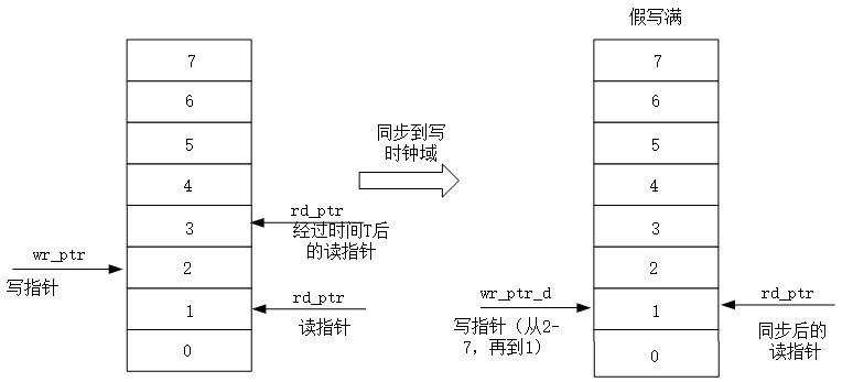 同步到寫時(shí)鐘域:讀指針同步到寫時(shí)鐘域需要時(shí)間T,在經(jīng)過T時(shí)間后,可能原來的讀指針會(huì)增加或者不變,也就是說同步后的讀指針一定是小于等于原來的讀指針的。寫指針也可能發(fā)生變化,但是寫指針本來就在這個(gè)時(shí)鐘域,所以是不需要同步的,也就意味著進(jìn)行對(duì)比的寫指針就是真實(shí)的寫指針。