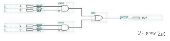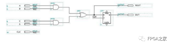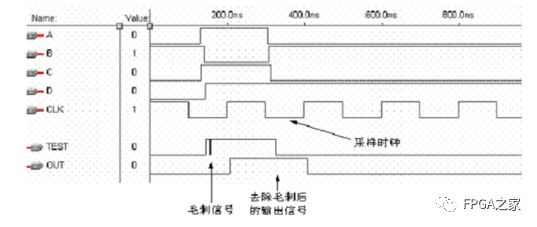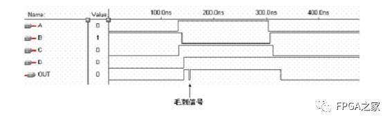 我們可以看到,A,B,C,D四個輸入信號,最后導致輸出出現(xiàn)毛刺。原因是A,B,C,D信號輸入不是同時發(fā)生。(即使同時發(fā)生,它們各自由于連線和邏輯單元的原因,到達門電路的時間也不同。)所以可以說,只要輸入信號同時發(fā)生變化,由于走線的原因,必將產(chǎn)生毛刺。所以我們不能直接將其輸出,要進行一些措施。