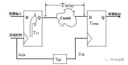 其中:tco為觸發(fā)器數(shù)據(jù)輸出延時;Tdelay=Tcomb 為經(jīng)過組合邏輯的延時 ;Tsetup(tsu)為建立時間;Tpd為時鐘延時,一般時鐘延時可以忽略。