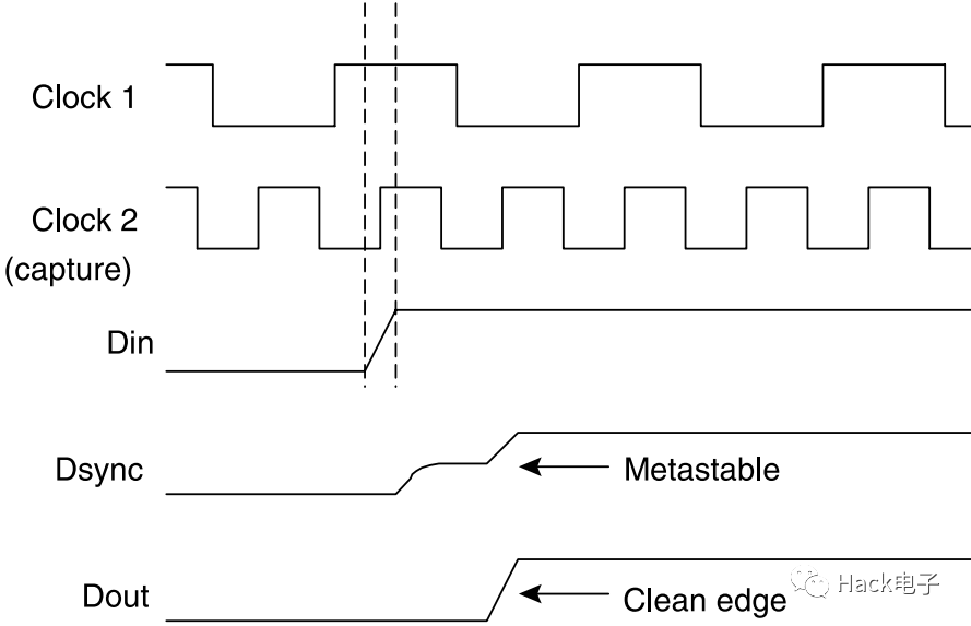 圖8所示的配置中,同步器電路(其輸入為Din)中的第一拍后也許會產(chǎn)生亞穩(wěn)態(tài),但是信號有機會在其被第二級鎖存以及被其它邏輯看到之前穩(wěn)定下來,如圖9所示。