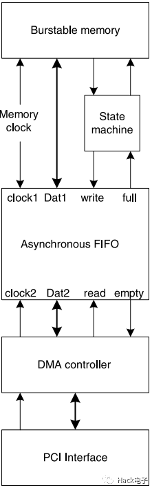 跨時鐘域傳輸數(shù)據(jù)用得最多的方法就是使用先入先出(即FIFO)結(jié)構(gòu)。FIFO可以用于在兩個異步時鐘域之間傳輸多個比特信號。我們通常看到的FIFO應(yīng)用包括在兩個標(biāo)準(zhǔn)總線之間傳輸數(shù)據(jù),以及從可突發(fā)訪問的存儲器中讀出數(shù)據(jù)或者對其寫入數(shù)據(jù)。例如,如圖11所示,顯示的是一個可突發(fā)訪問存儲器與一個PCI總線之間的接口。