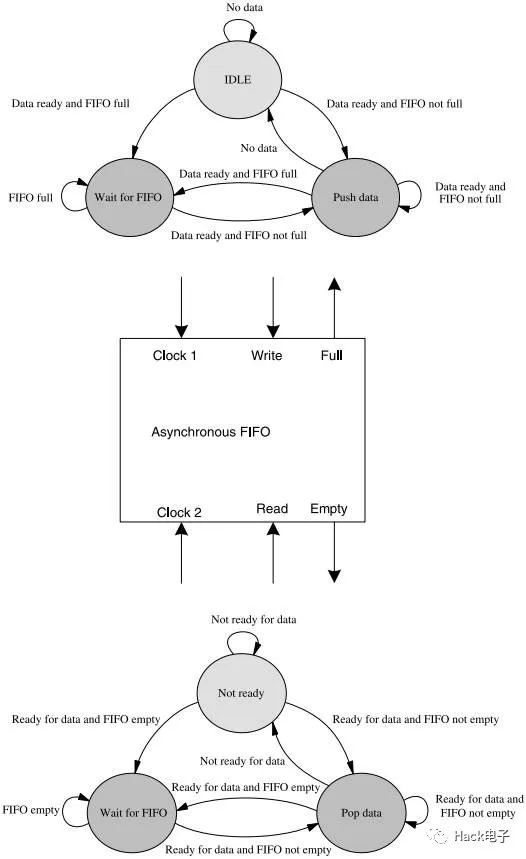 在很多例子中,不管是突發(fā)尺寸還是數(shù)據(jù)到達的分配都無法很好地定義。這種時候,就有必要使用握手控制來防止FIFO產(chǎn)生數(shù)據(jù)溢出。如圖13所示,這種握手控制通常由一些標(biāo)志信號來實現(xiàn)。這些標(biāo)志信號,一個是發(fā)送側(cè)的滿標(biāo)志,用于提示FIFO沒有多余空間存儲數(shù)據(jù)了,另一個是而空標(biāo)志,用于提示接收側(cè),F(xiàn)IFO中沒有數(shù)據(jù)需要處理了。管理這些握手信號可能還需要一個狀態(tài)機,正如圖13所示。