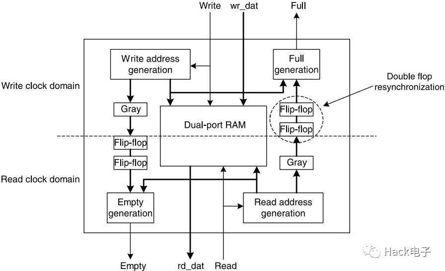 需要額外注意的一點是,由于只有讀寫地址是需要在異步時鐘域之間傳遞,所以地址就有可能比預(yù)想的晚一個時鐘周期,同時意味著空或者滿標(biāo)志置位晚一個時鐘周期,但是這并不表示錯誤導(dǎo)致了數(shù)據(jù)溢出狀況。如果這種情況在傳遞地址到讀時鐘域時,讀邏輯將簡單地認(rèn)為數(shù)據(jù)沒有寫入,且將認(rèn)為FIFO已空盡管此時FIFO已經(jīng)被寫入一個數(shù)據(jù)。這只會對總的吞吐率有一些小影響,但是不會導(dǎo)致下溢(即讀已空的FIFO)狀況發(fā)生。同樣地,當(dāng)?shù)刂繁粋鬟f到寫時鐘域時,如果讀地址被延時了,那么寫邏輯會認(rèn)為FIFO里沒有多余空間,盡管此時FIFO還未滿。這同樣只會對總的數(shù)據(jù)吞吐率有些微小影響,卻不會造成上溢(寫已滿的FIFO)發(fā)生。