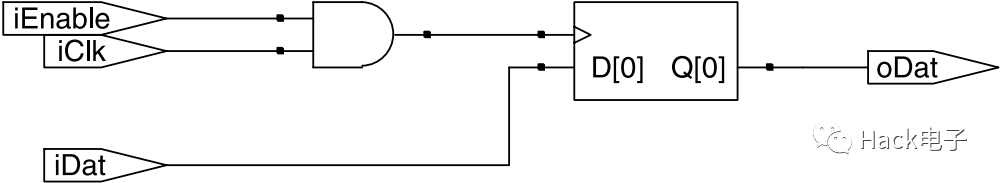 module clockstest( output reg oDat, input iClk,iEnable, input iDat); wire gated_clock=iClk&iEnable; always @ (posedge gated_clock) oDat<=iDat; endmodule