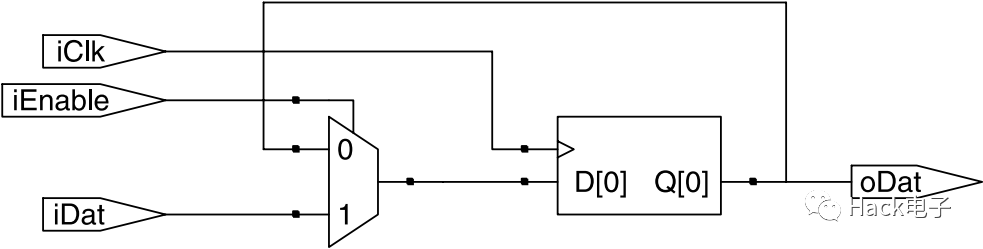在上面的代碼中,系統(tǒng)時鐘被一個使能信號門控產(chǎn)生一個門控時鐘。這個門控時鐘被用于驅(qū)動觸發(fā)器oDat,而oDat用于寄存器輸入iDat。如果沒有啟用“fixing the clock gating”選項,那么綜合工具將會直接實現(xiàn)邏輯功能,如圖17所示。