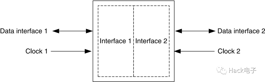 這里以及后面章節(jié)提到的時鐘域,是指一組邏輯,這組邏輯中的所有同步單元(觸發(fā)器、同步RAM塊以及流水乘法器等)都使用同一個網(wǎng)絡(luò)作為時鐘。假如設(shè)計中所有的觸發(fā)器都使用一個全局網(wǎng)絡(luò),比如FPGA的主時鐘輸入,那么我們說這個設(shè)計只有一個時鐘域。假如設(shè)計有兩個輸入時鐘,如圖1所示,一個時鐘給接口1使用,另一給接口2使用,那么我們說這個設(shè)計中有兩個時鐘域。