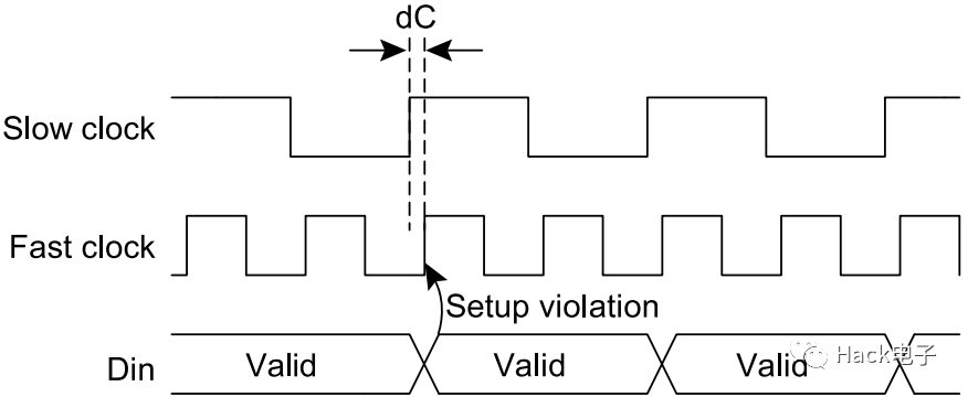 如圖4所示,低速時鐘的周期是高速時鐘周期的兩倍。低速時鐘上升沿與高速時鐘上升沿之間的間隔為常量,而且總是等于dC。由于這兩個時鐘的這種相位匹配關(guān)系,dC總是保持不變(假定頻率沒有漂移),而且在這個例子中,dC總是大于邏輯延時與高速時鐘驅(qū)動的觸發(fā)器建立時間之和。