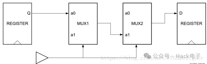 兩個(gè)多路選擇器MUX控制兩個(gè)寄存器間的數(shù)據(jù)傳輸,但是兩個(gè)MUX采用同一個(gè)選擇信號(hào)。仔細(xì)分析會(huì)發(fā)現(xiàn),無(wú)論如何Q端數(shù)據(jù)都無(wú)法傳遞到D端。雖然結(jié)構(gòu)圖上看起來Q和D之間存在一條路徑,但是沒有起到任何功能,因此應(yīng)該定義為虛假路徑。