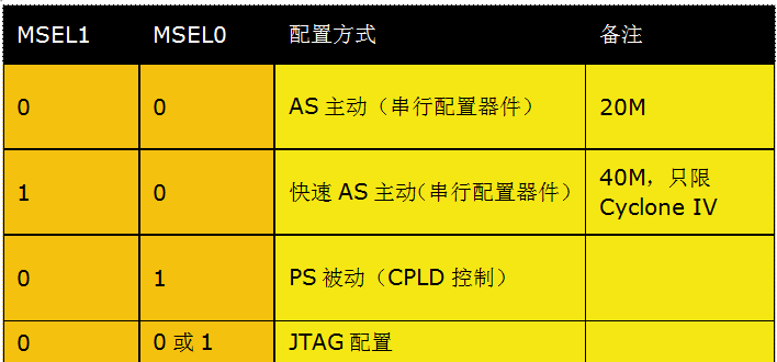 用戶可以通過設置FPGA上的MSEL0、MESL1兩個引腳的狀態(tài)來選擇配置方式。各種方式的MSEL0、MESL1設置如下表所列: