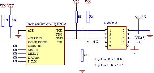 因為FPGA上的nSTATUS、CONFIG_DONE管腳都是開漏結構,所以都要接上拉電阻。FPGA的片選腳nCE必須接地。