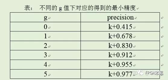 其中0.1d1d2d3…dn。對于輸出位寬m=k+g,能得到的設(shè)計精度如下表格: