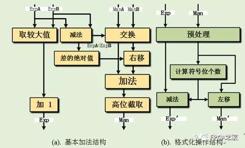 由于定點的四則運算比較簡單,如加減法只要注意符號擴展,小數(shù)點對齊等問題即可。在本文中,運用在前一節(jié)中描述的自定義浮點格式FPGA中數(shù)的表示方法(下),完成浮點四則運算的實現(xiàn)過程